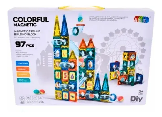 Aprender nunca fue tan divertido. Este set de 97 bloques magnéticos está diseñado para estimular la creatividad, el pensamiento lógico y la coordinación mano-ojo de los niños y niñas a partir de los 3 años.